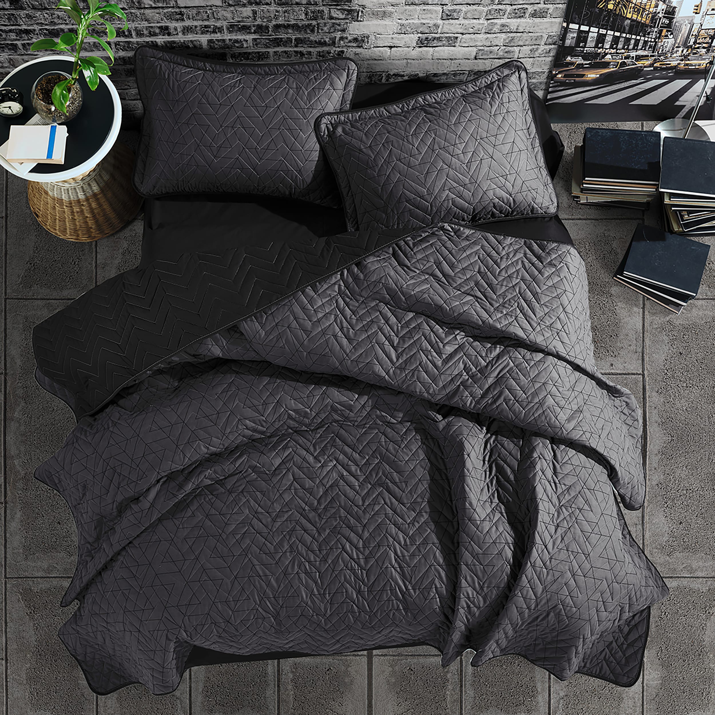 Setul include cuvertură matlasată cu dimensiunile 240×260 cm + 2 fețe de pernă 50×70 cm, oferind acoperire completă pentru patul tău. Caracterul reversibil al cuverturii îți permite să alternezi între două aspecte diferite, reîmprospătând decorul fără costuri suplimentare și prelungind astfel viața utilă a produsului.