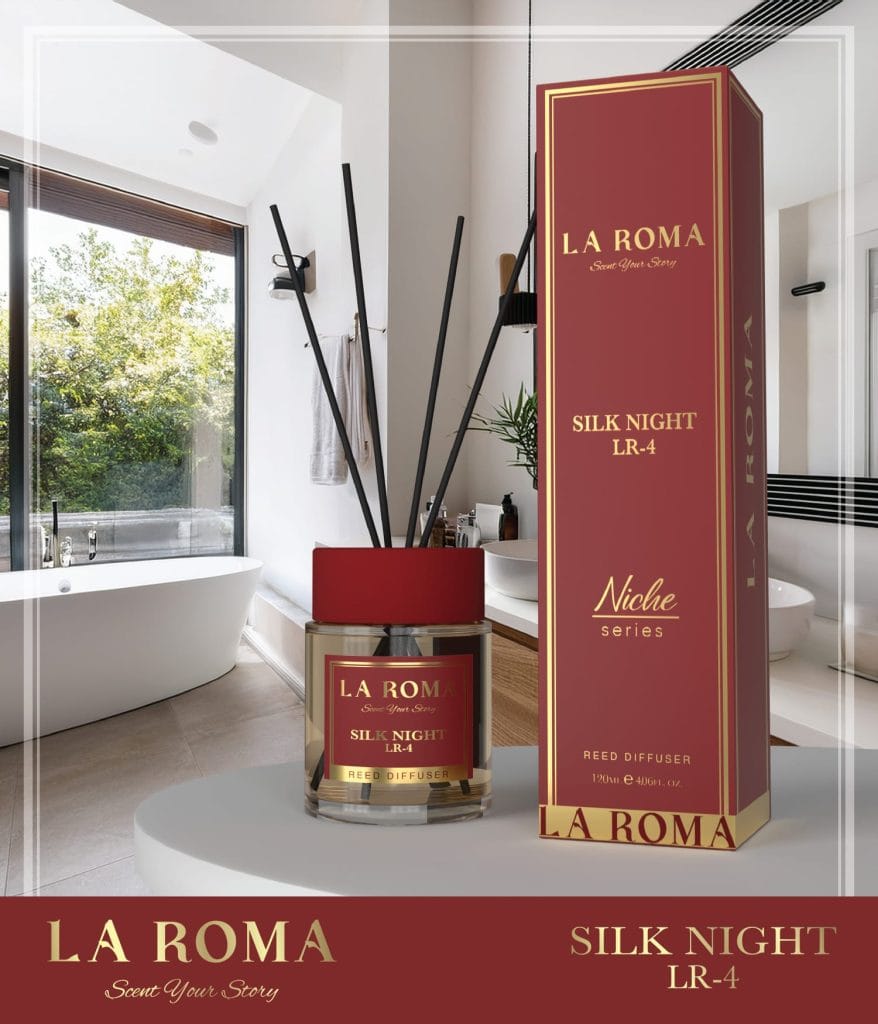 Odorizant camera cu bete La Roma Niche LR 4 – Silk Night 120ml. Lasă magia nopții să pătrundă în casa ta cu La Roma Niche LR 4 – Silk Night. Un odorizant de cameră exclusivist. Este inspirat de misterul și eleganța serilor de vară. Perfect pentru a crea o atmosferă relaxantă, seducătoare și plină de rafinament.